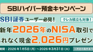 お得キャンペーンクレカ積立OK!SBI証券でNISA取引すると2026円もらえる SBI証券でNISA取引している方! 2026年分の買付で条件を達成すると現金2,026円プレゼントされるキャンペーンやってます! キャンペーン内容 ■残高判定時にSBI新生銀行のSBIハイパー預金に10万円以上あり、SBI証券のNISA口...2026.01.16お得キャンペーン