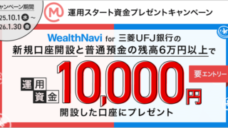 お得キャンペーン1万円もらえるのでウェルスナビ三菱UFJ銀行の開設してみた ウェルナビ三菱UFJ銀行の新規口座開設で運用資金10,000円もらえるキャンペーンが実施中です。 実際に口座開設もやってみました。 ウェルスナビ三菱UFJ銀行のキャンペーンについて その前に、ウェルスナビとは、ウェルスナビ株式会社が提供する...2026.01.22お得キャンペーン