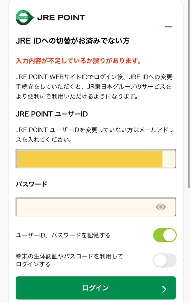 JRE POINTのIDとパスを求められるのでログイン(アプリから移ったのはJRE POINTのWEBサイトだった。アプリではなく初めからWEBサイトに行けば良かっただけ?)