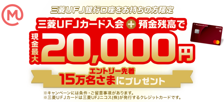 三菱UFJ銀行口座をお持ちの方限定で、三菱UFJカードに入会して、預金残高が条件を満たすと現金最大20,000円もらえるキャンペーンが実施中です!