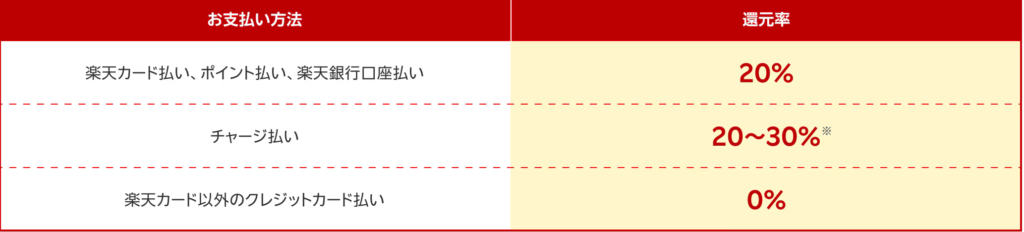 以下のような還元率になると、楽天モバイルHPには20倍になった時の還元率が載っていました。
